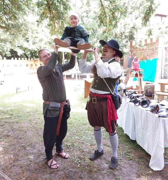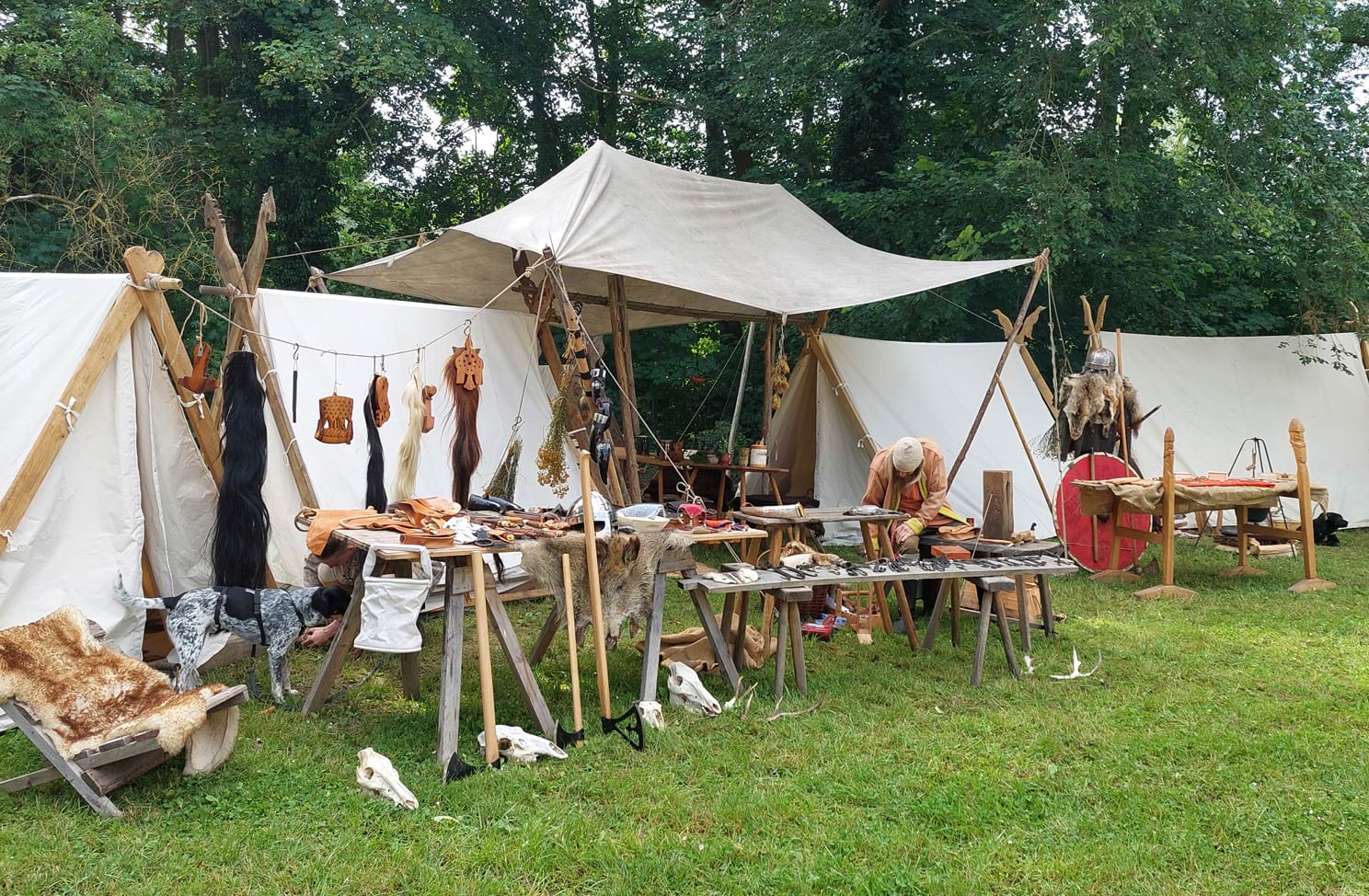 Wir sind die Babenlande-Eberbande und leben eine Nordmann-Darstellung aus dem Frühmittelalter. Bei uns kannst Du von Gorm etwas über die Nordische Mythologie erfahren und Feuerschlagen lernen, unserer Seherin Verdandi Fragen stellen und Iben ist unsere »Frauenbeauftragte«, die Dir etwas über die Frauenrechte im Frühmittelalter erzählen kann. Ebenso zeigen wir Dir Lederarbeiten und den Messerbau. Erlebe einen Tag verschiedener Zeitepochen und Fantasie.