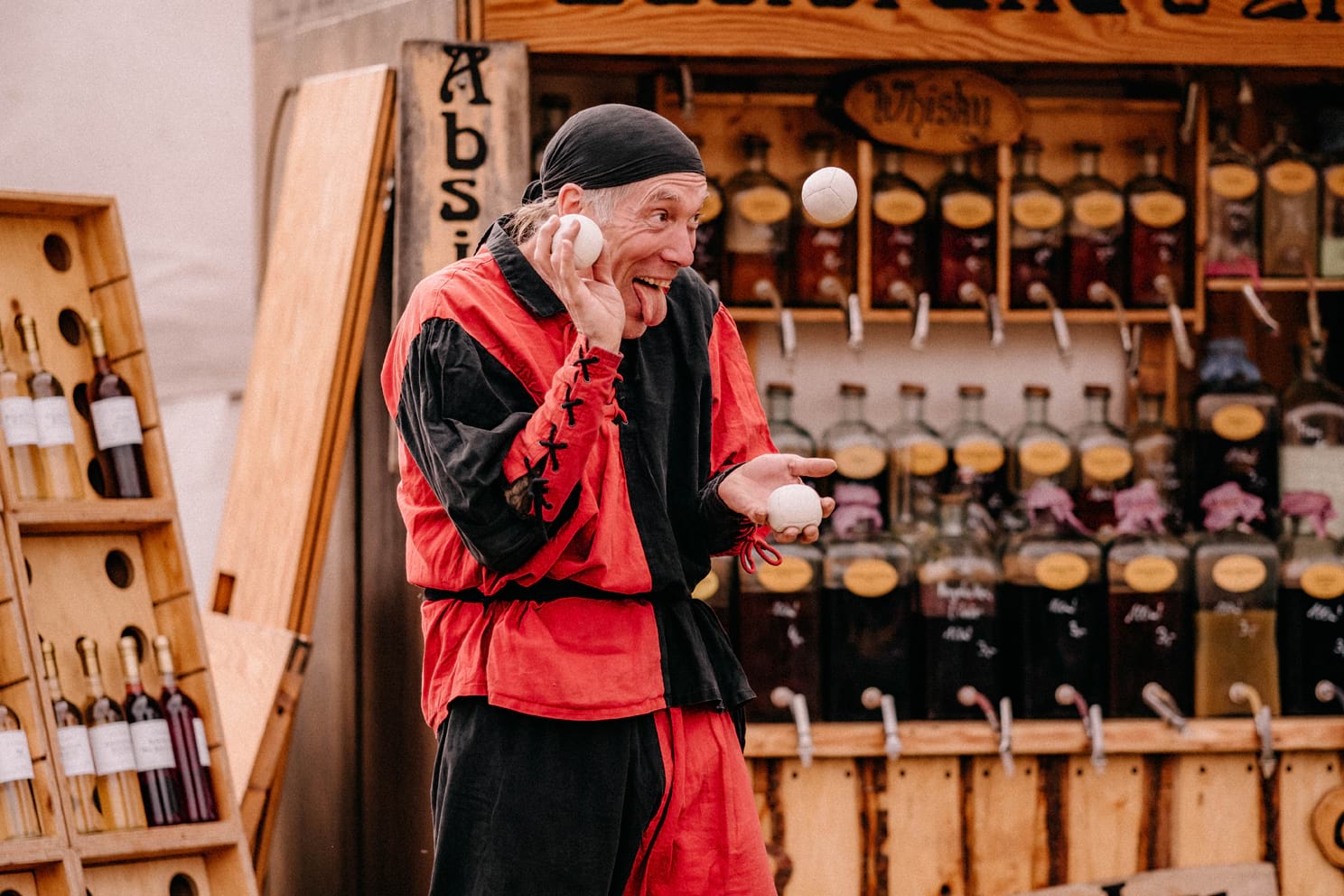 Dort, wo eben noch die Straße war, ist jetzt seine Bühne. Lupus weiß wohl drum, das Volk um sich zu scharen. Mit Witz und brillanter Darbietung seiner Jonglagekünste zieht er jung und alt in seinen Bann. Er manipuliert drei einfache Holzkistchen so, dass dem Betrachter Zweifel kommen, ob die Schwerkraft wohl noch existiert. Lupus jongliert bis zu sieben Bälle, aber damit lange nicht genug … Lupus, der Furchtlose zeigt auch atemberaubende Kunststücke mit drei, vier und fünf Feuerkeulen.