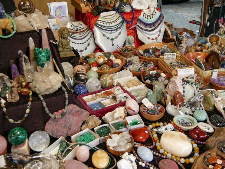 Mein Stand »heilsame Steine« ist eine Reise nach Plattenburg wert! Du findest hier über 150 verschiedene Steinsorten als Mineral, Handschmeichler, Figur oder zu Schmuck verarbeitet. Jeder Stein hat eine bestimmte Botschaft an Dich. Mit meiner über 30-jährigen Erfahrung mit Heilsteinen berate ich Dich gerne. Komm vorbei!
